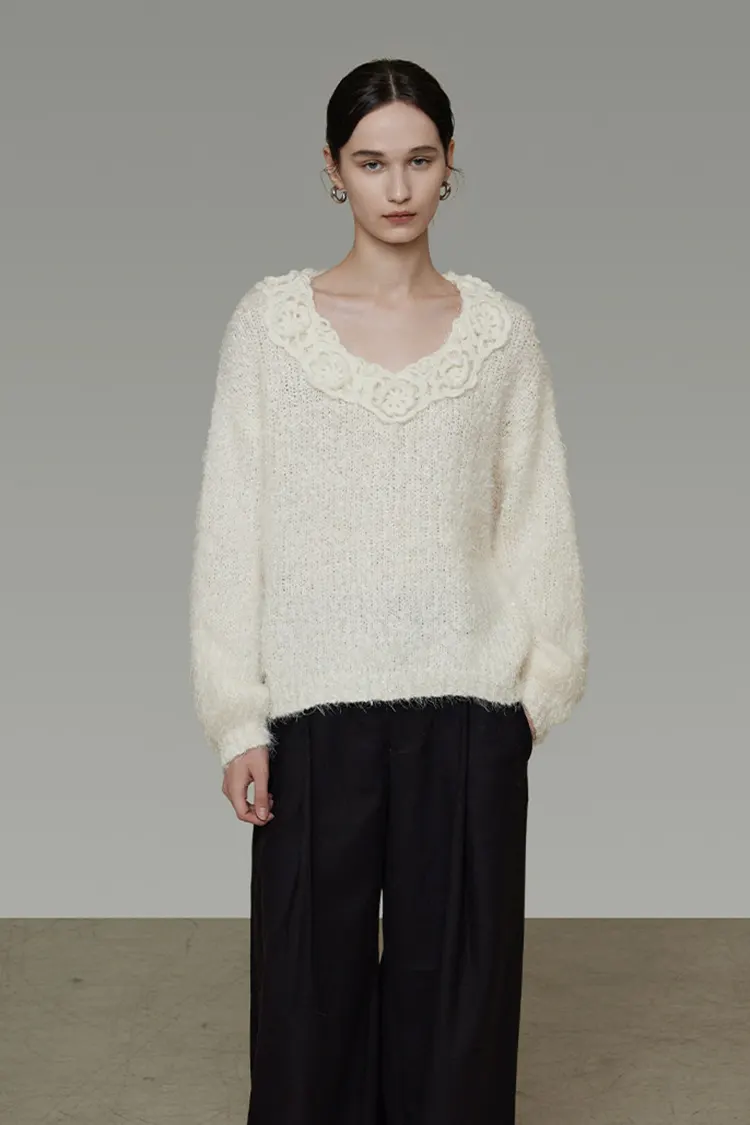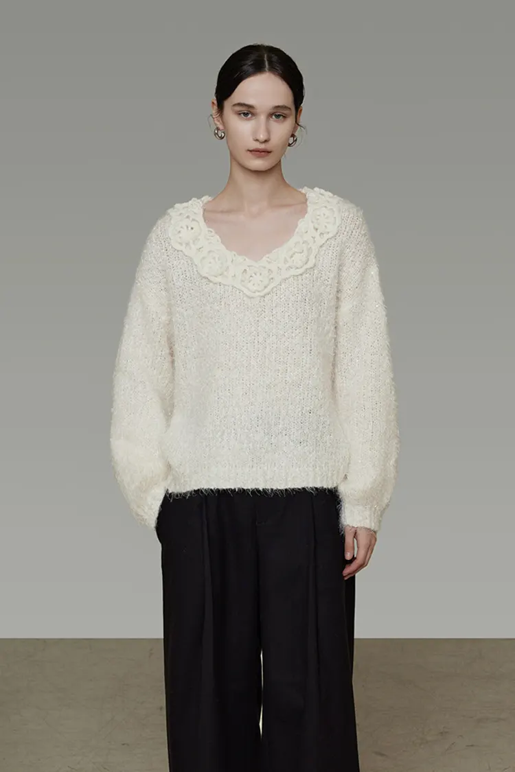Damtröjan i 3D spets har en djup V-ringad design. Kanten på halsen är prydd med utsökt broderade genombrutna spetsar, kompletterat med små tygknappar av samma tyg. Det tredimensionella spetshantverket är tydligt lager, med fina och mjuka detaljer. Den övergripande looken är söt, romantisk och ändå elegant. Oavsett om den ses framifrån eller bakifrån, har den en stark designkänsla, vilket gör det möjligt för den grundläggande enfärgade tröjan att bryta sig loss från monotonin och utan ansträngning förstärka sofistikeringen i outfiten. Den är mycket lämplig för konsumenter som värdesätter detaljer och textur.
