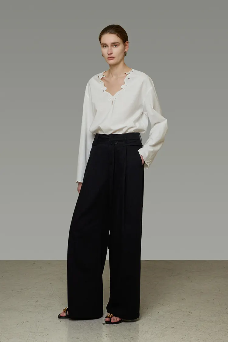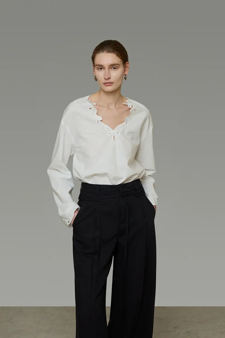 Tygets naturliga struktur kompletterar de broderade utskärningsdetaljerna, vilket helt återspeglar varumärkets strikta urval av material och hantverk.